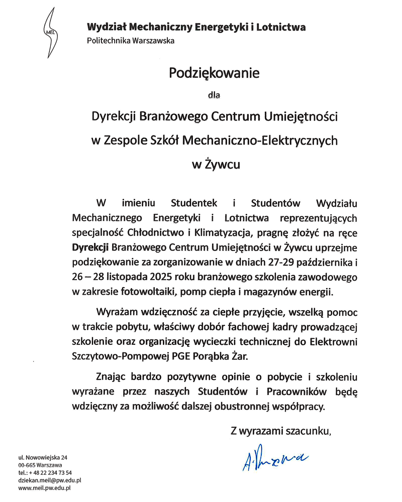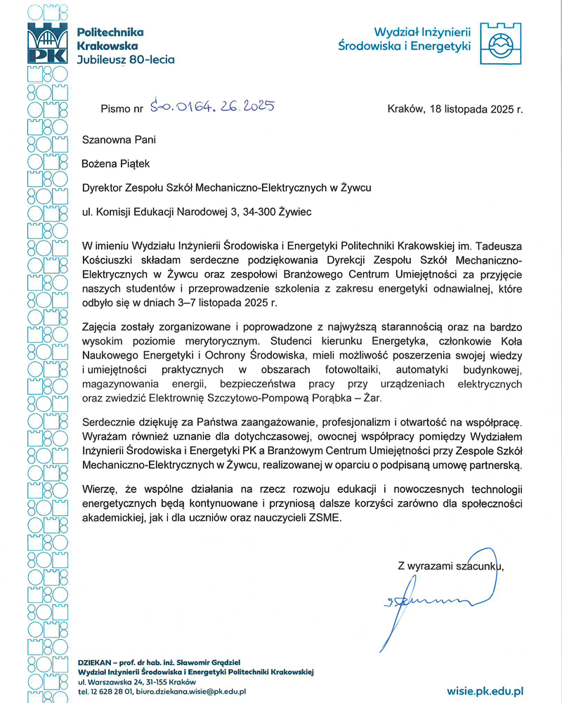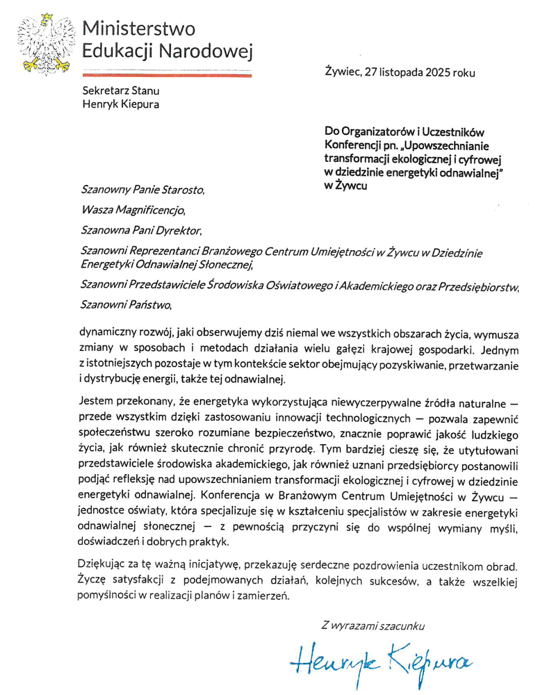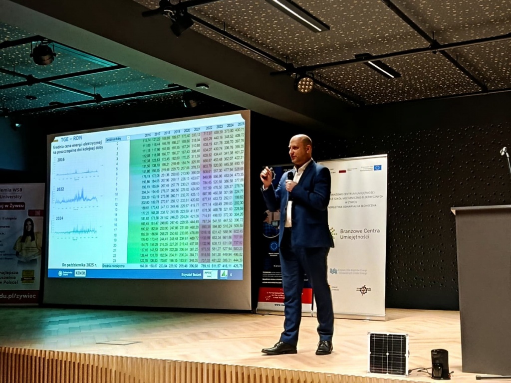 W dniu 27 listopada br. w Branżowym Centrum Umiejętności w Zespole Szkół Mechaniczno-Elektrycznych w Żywcu odbyła się konferencja naukowa poświęcona najnowszym trendom, badaniom oraz innowacjom w dziedzinie energii odnawialnej, transformacji ekologicznej oraz cyfryzacji sektora energetycznego.